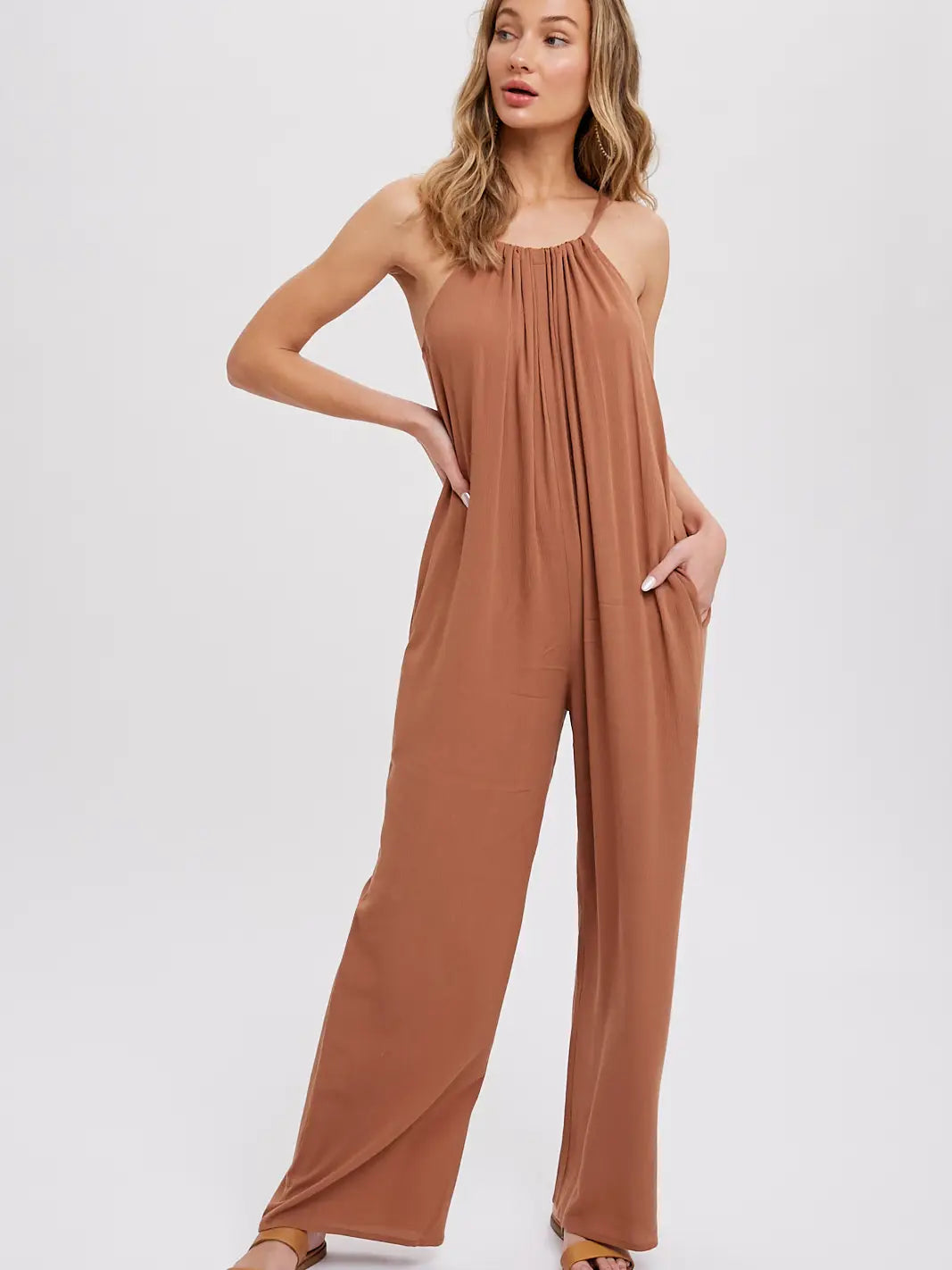 Comfortable woven jumpsuit featuring a halter neck with adjustable strap, side seam pockets, wide leg, relaxed fit
