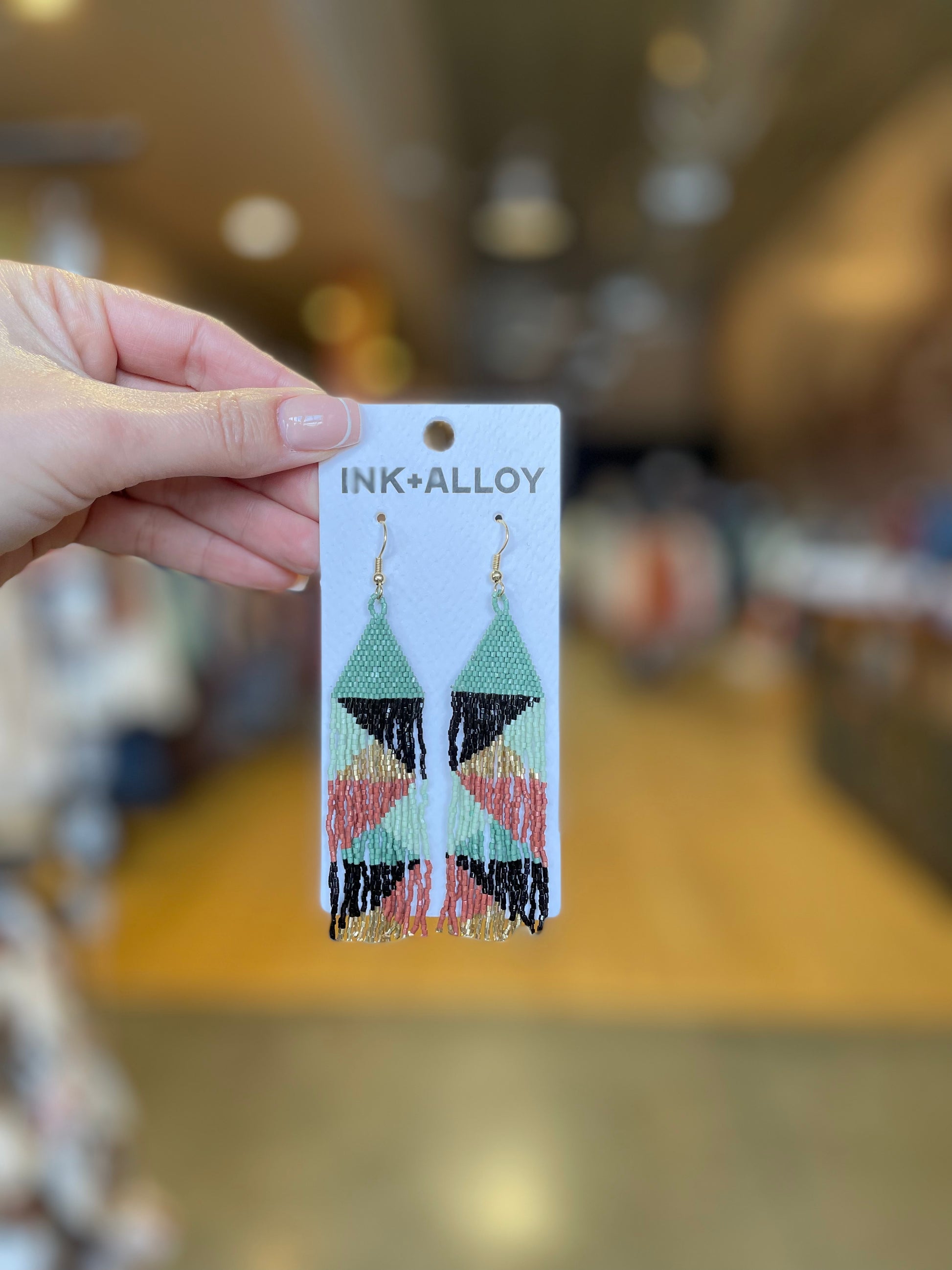 Brittany Mixed Triangles Beaded Fringe Earrings Greens + Rust