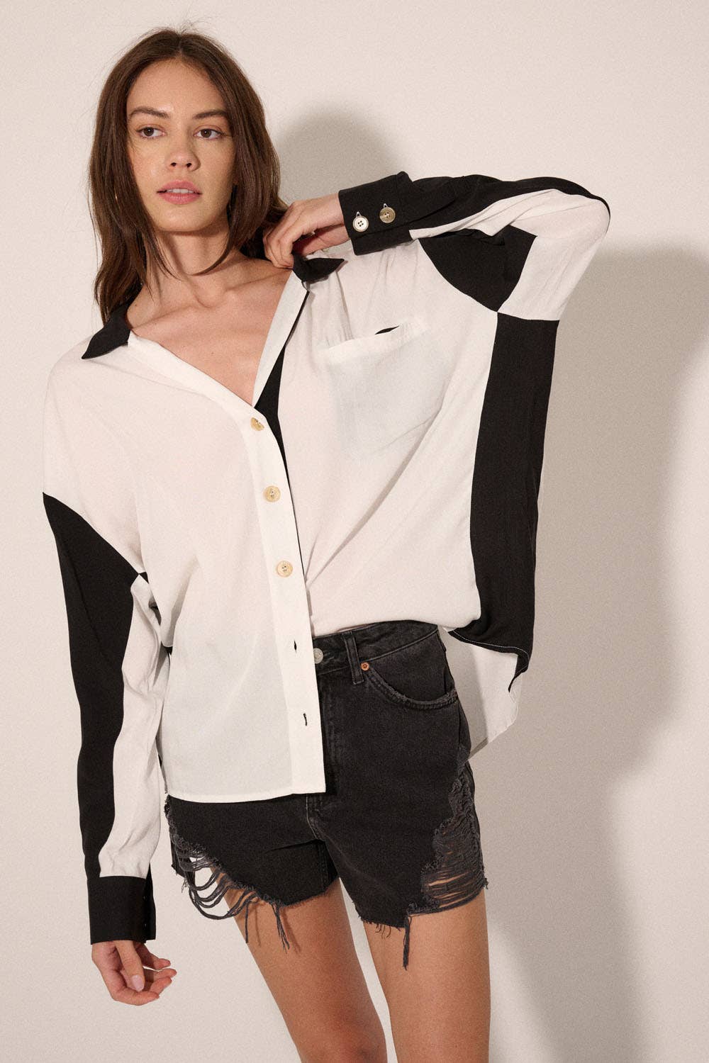 Color Block Collar Neck Long Sleeve Woven Shirt