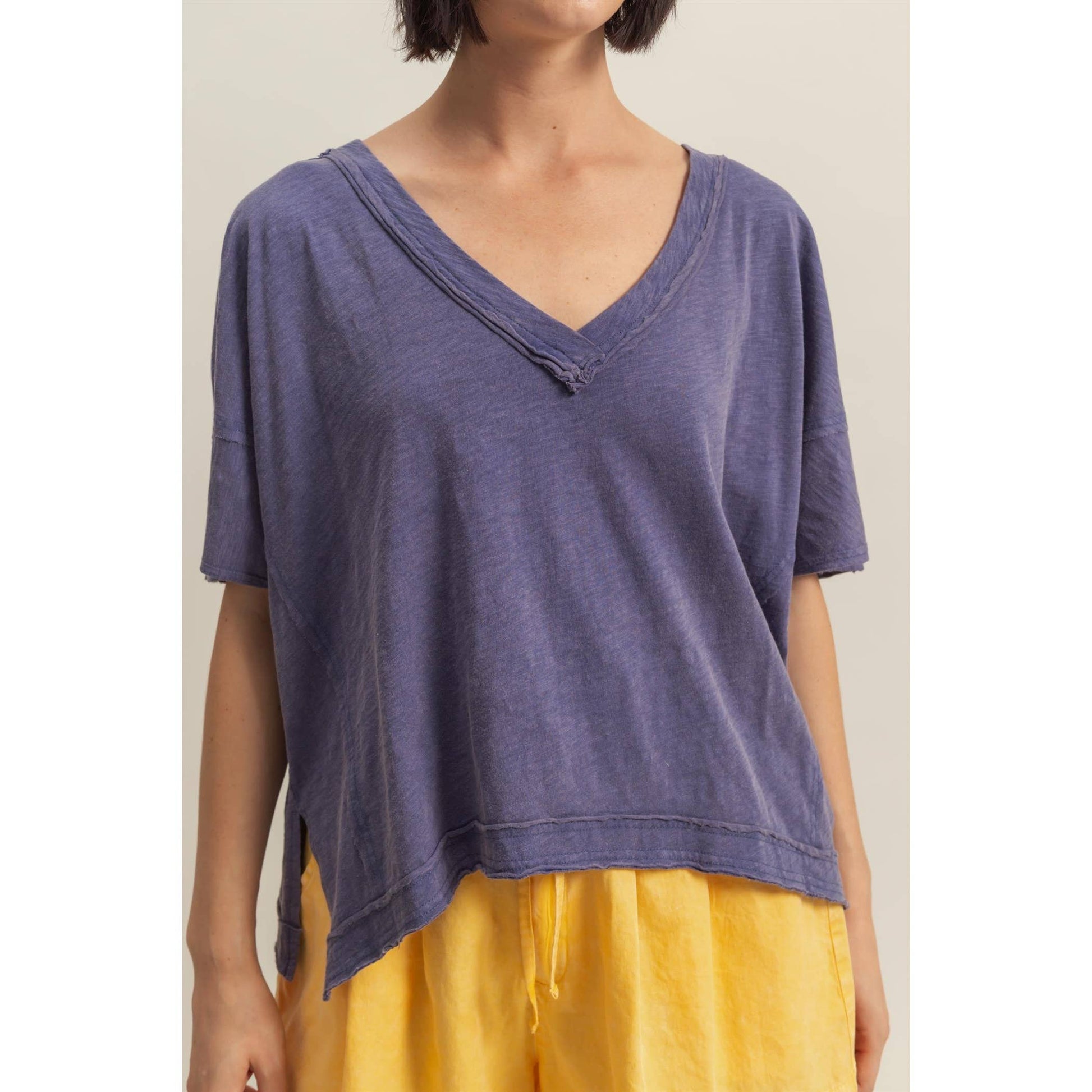 Lightweight Fabric Shapes This Top That Has A V Neckline, Short Sleeves And Side Slit Detailing Along The Hem. The Raw Edge Cut Detail Gives This Shirt A Super Casual Touch.