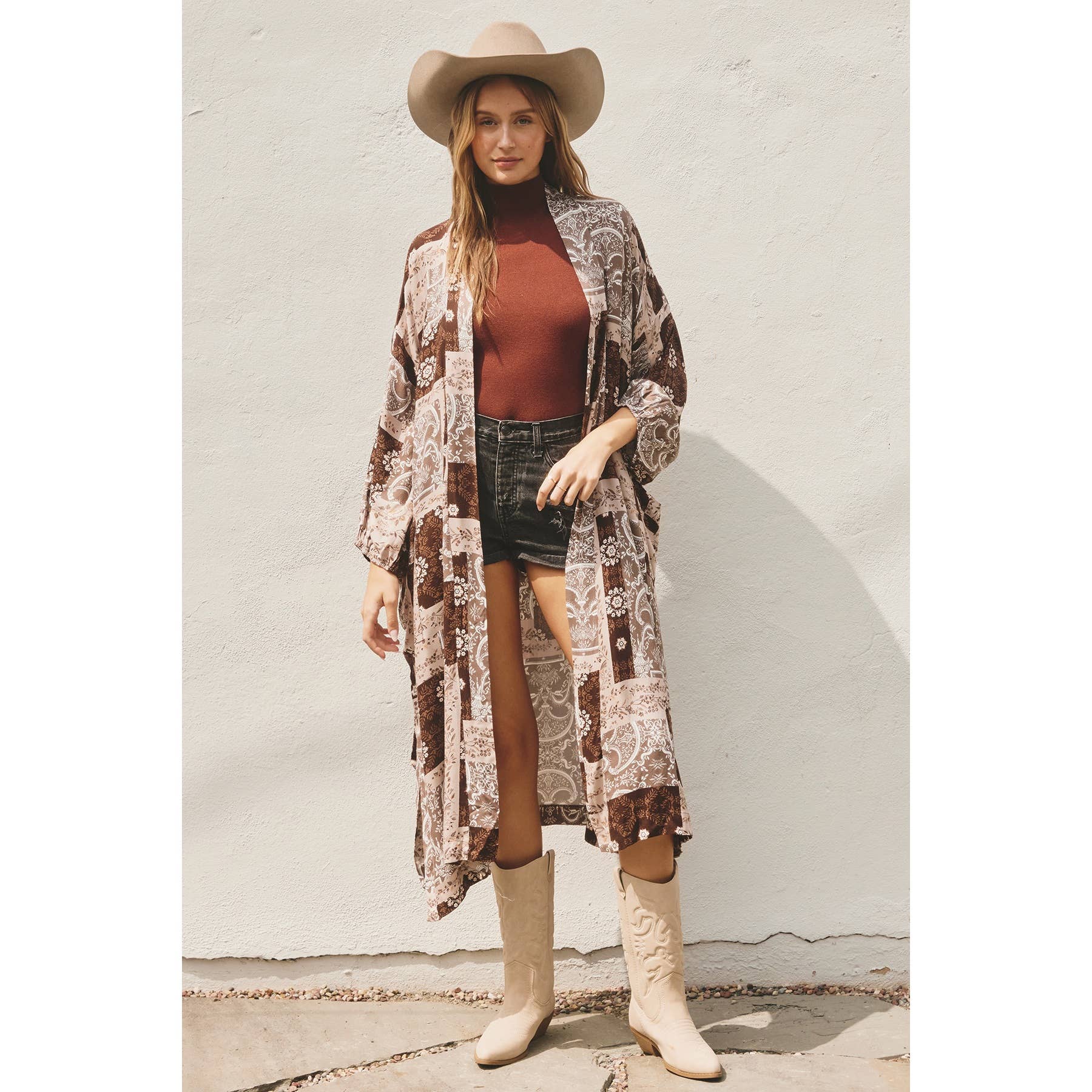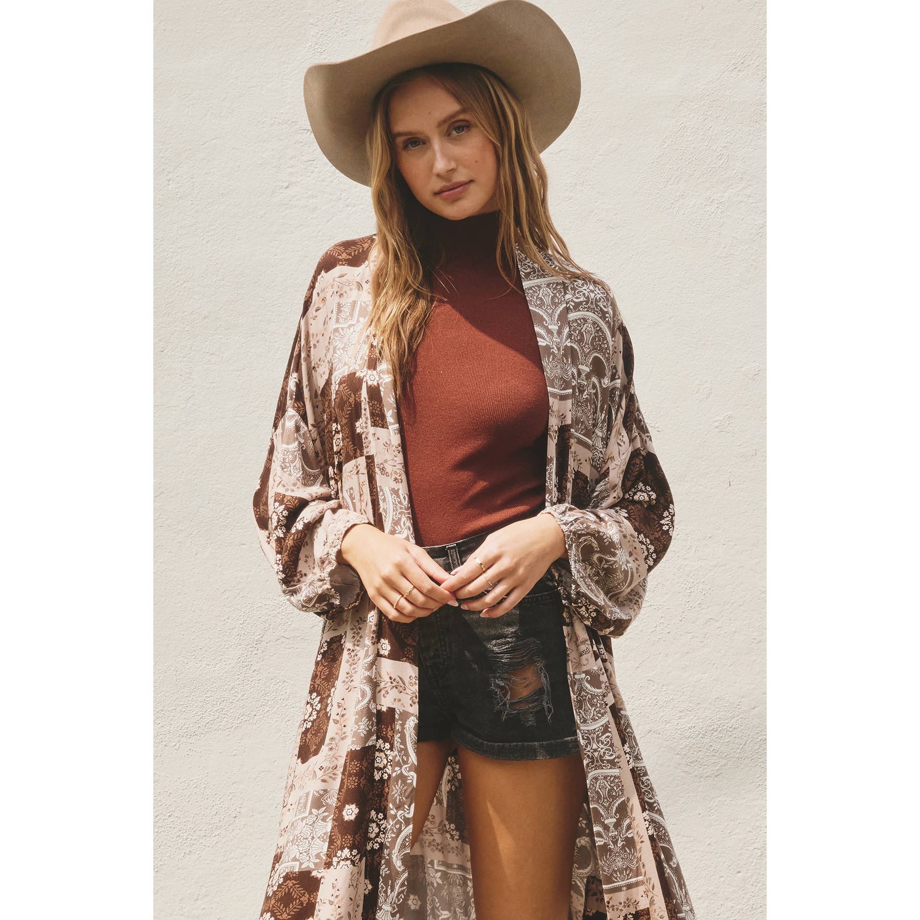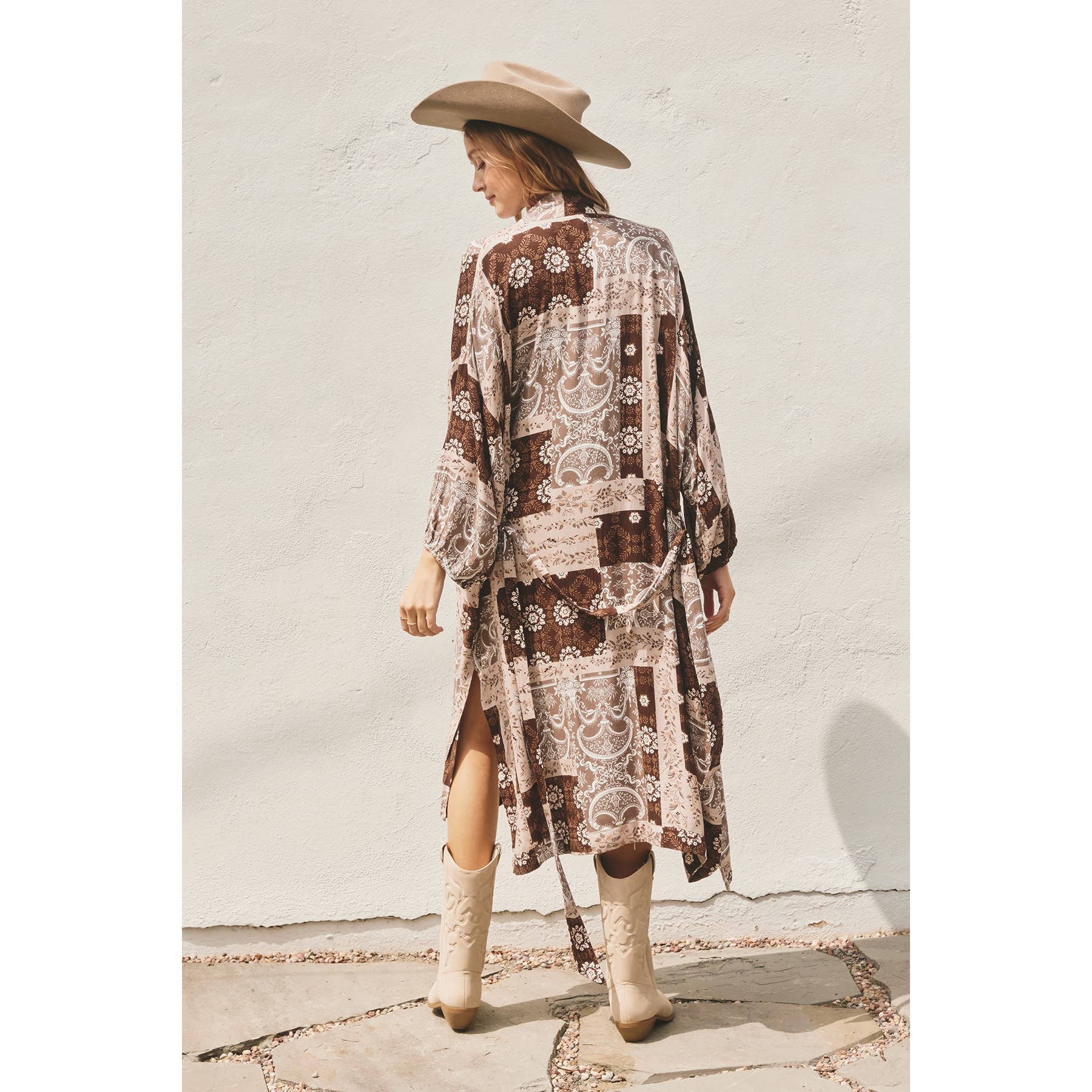 This is a long kimono duster with bubble sleeves with elastic openings, front patch pockets, and a sash belt. For colder weather, this can be styled with tall boots and felt hats to achieve the boho vibe. Model is 5'10" and wearing size Small. Shell: 100% Rayon Lining