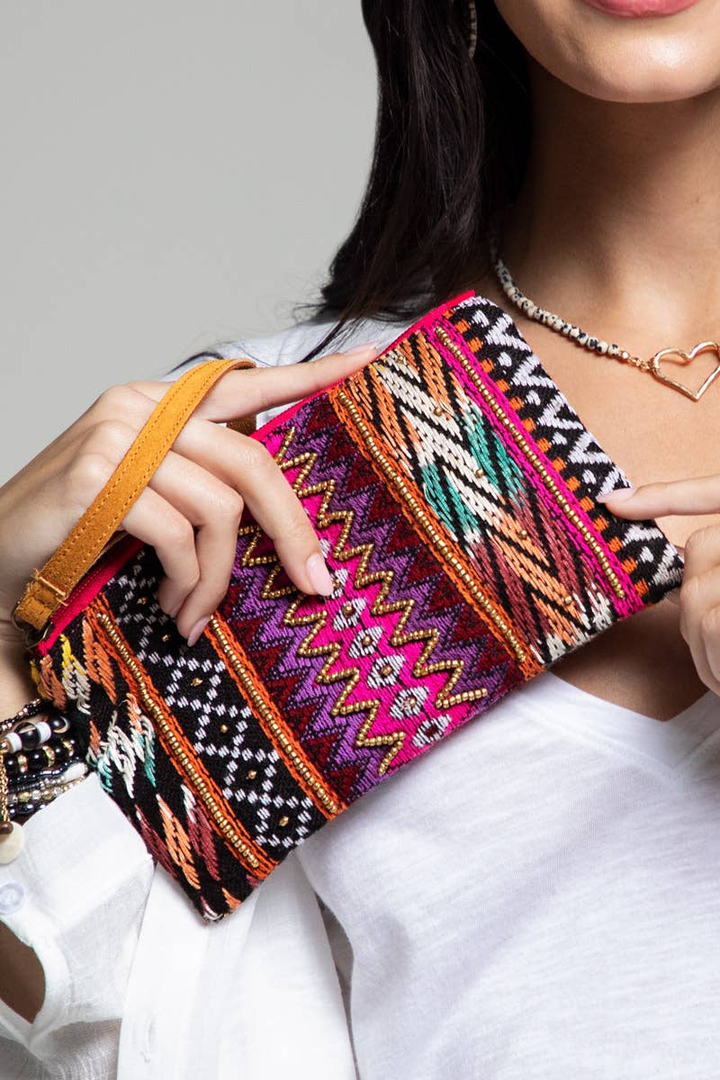 Handmade fine cotton yarn dye jacquard ethnic pattern with beads leather wristlet clutch