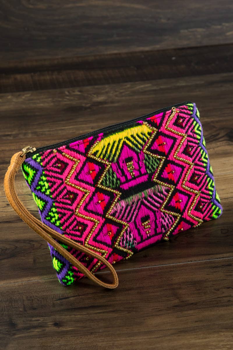 Handmade ethnic pattern and seed bead clutch with leather wristlet
