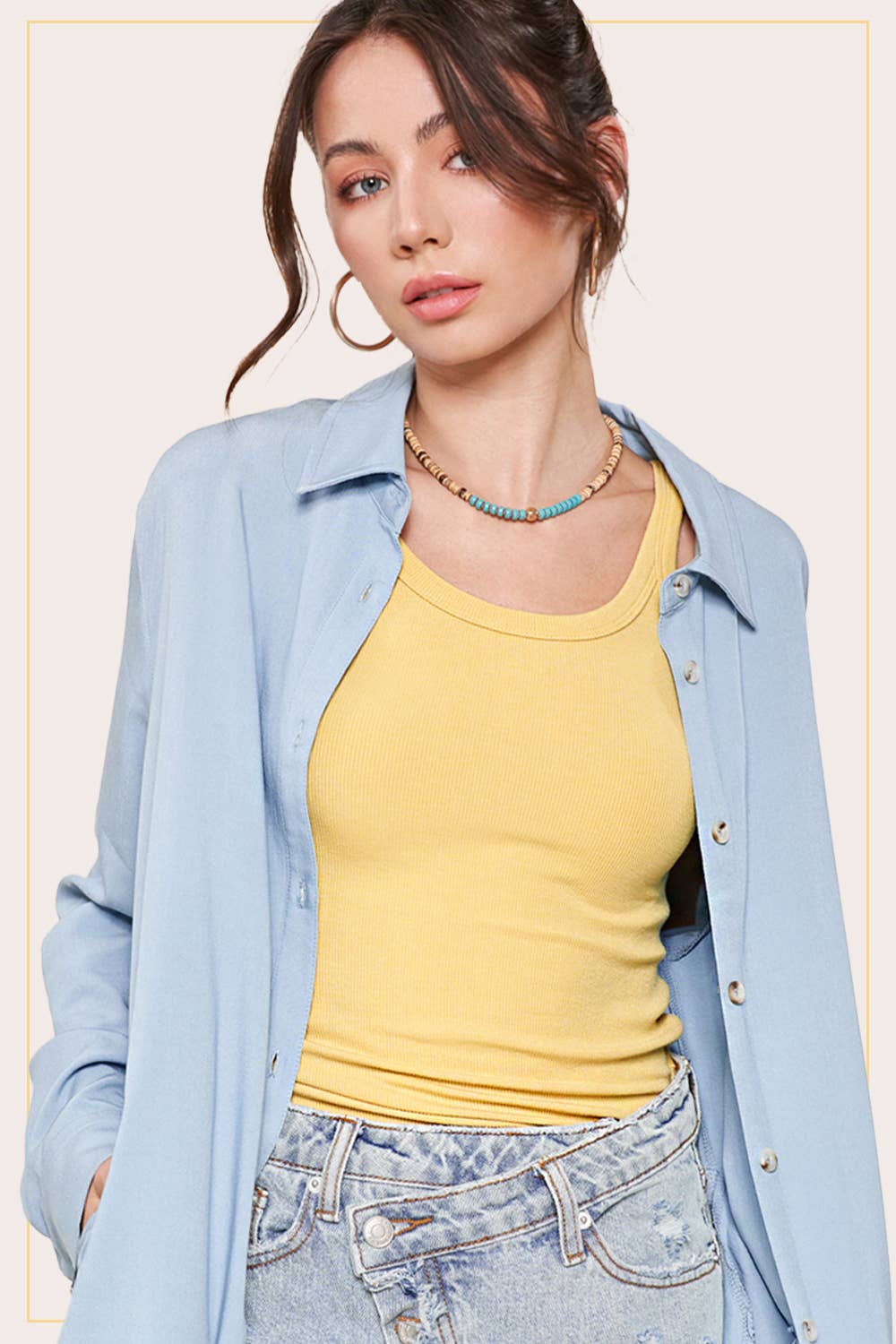 Keep things simple in the basic tank top with our top! This stretchy ribbed tank is the perfect, quality basic for anyone's wardrobe. Great for layering in the cooler months and cute worn alone during the warmer times or on vacation.