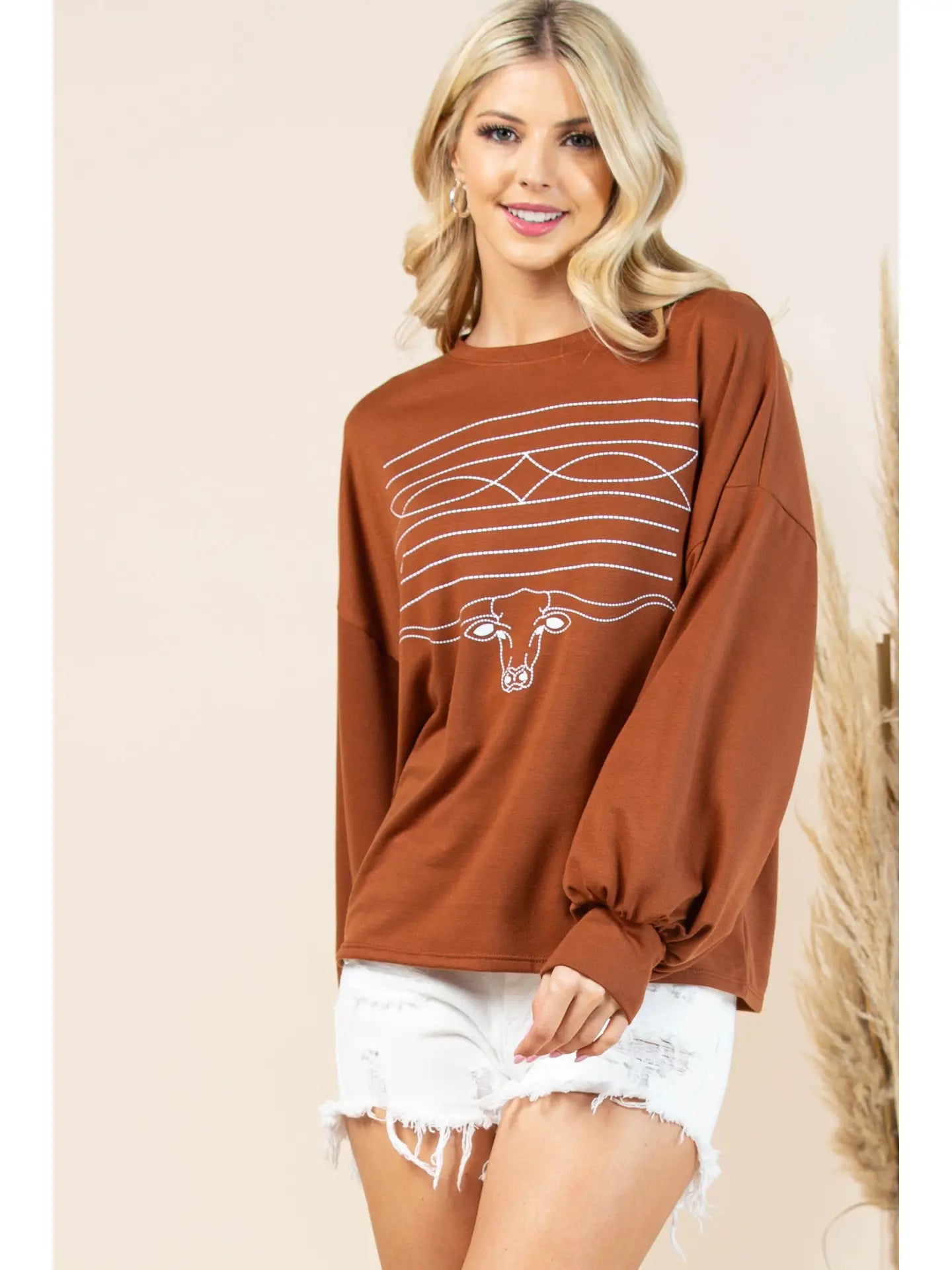 Longhorn Boot Stitch Vinyl Graphic Relaxed Fit Light Weight French Terry Long Sleeve Sweatshirt