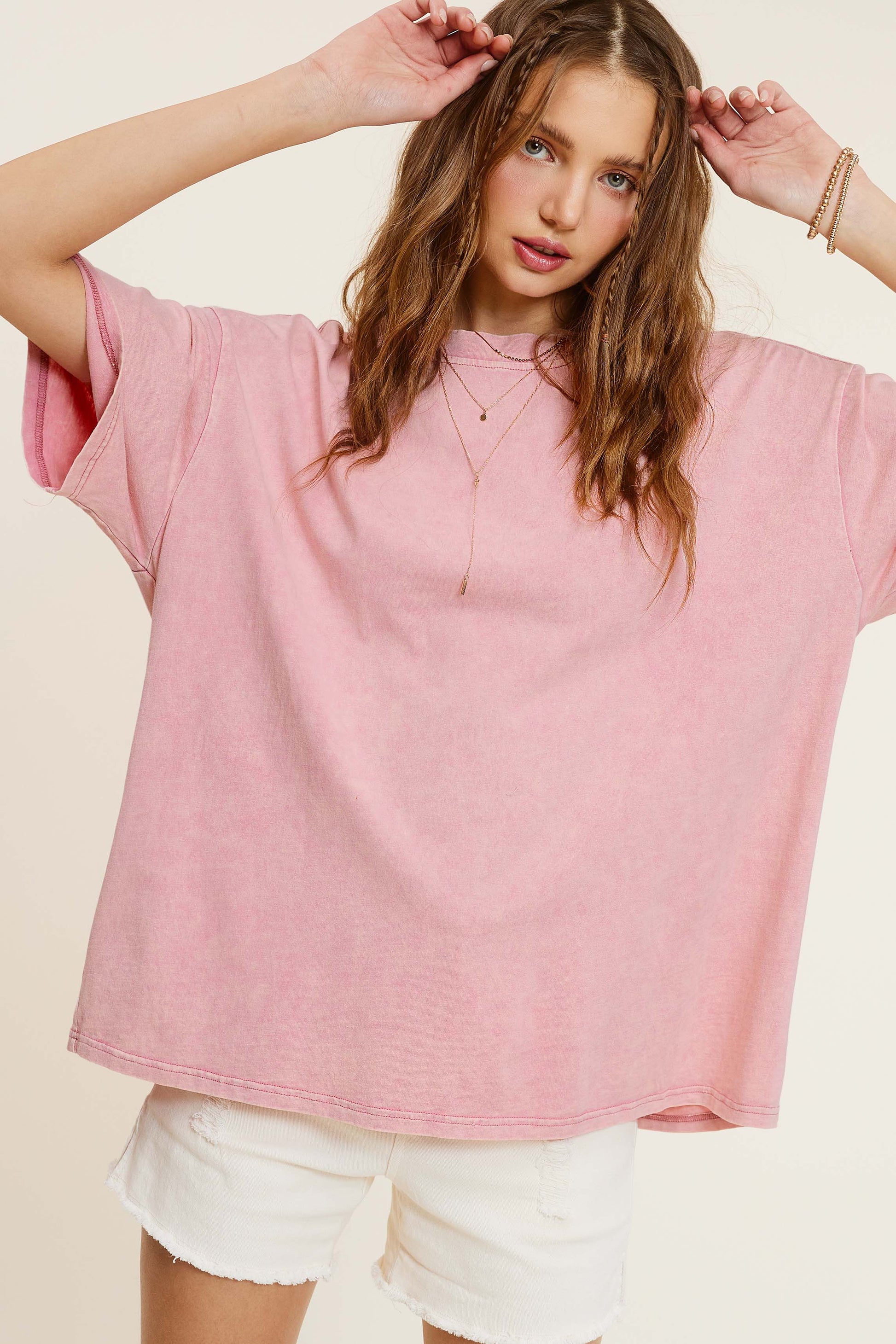 This will be your all-time favorite t-shirt, featured in a slouchy, oversized design with mineral washed fabric. Perfect for lounging, outdoor activities and so more. Match with shorts or jogger pants for a comfy yet stylish look. Match with your favorite bottom and shoes for a variety look this season.