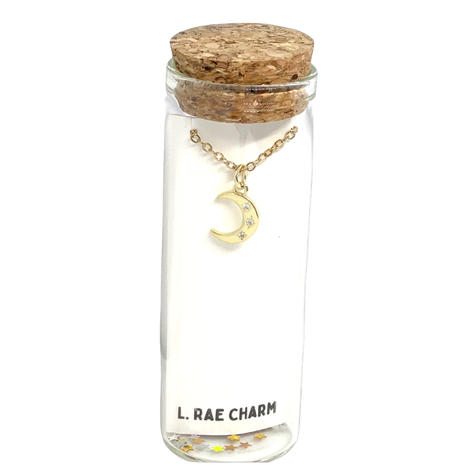 Moon CZ Crystal Star Gold Necklace Non-tarnish stainless steel 18” chain Displayed in unique glass cork jar packaging with fun confetti. Perfect for gift giving! Crafted with love from top-notch stainless steel, they're waterproof too, so no worries about turning green. Displayed in unique glass cork jar packaging with fun confetti. Perfect for gift giving and for gift baskets. Made in Tennessee Mother Daughter/Duo NOT on Amazon