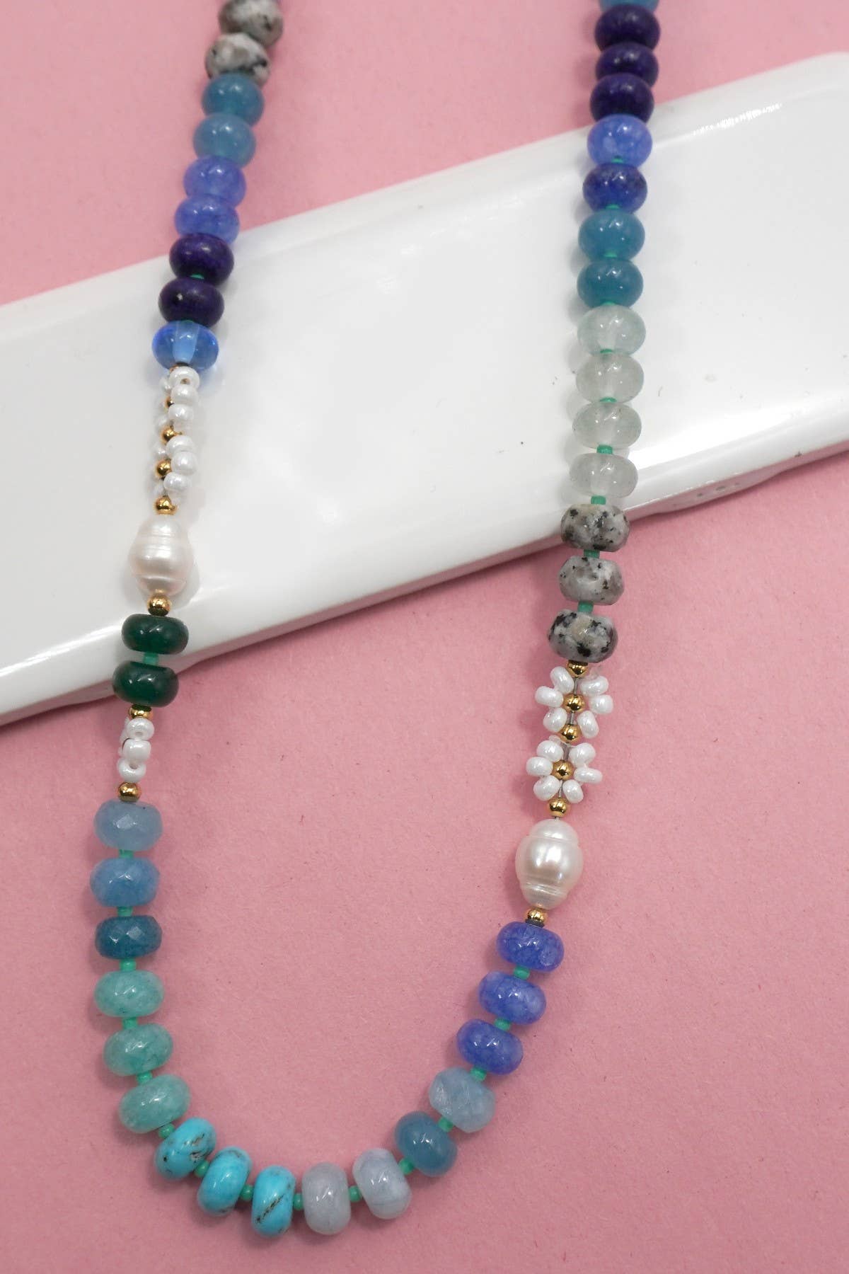 Natural Stone Semi-Precious Mixed Pearl Beaded Necklace is a beautifully crafted piece featuring a blend of natural semi-precious stones, lustrous pearls, and durable stainless steel accents. This elegant combination offers a balance of organic charm and modern durability, making it perfect for everyday wear or layering with other favorites. A timeless accessory that adds texture, color, and sophistication to any jewelry collection.