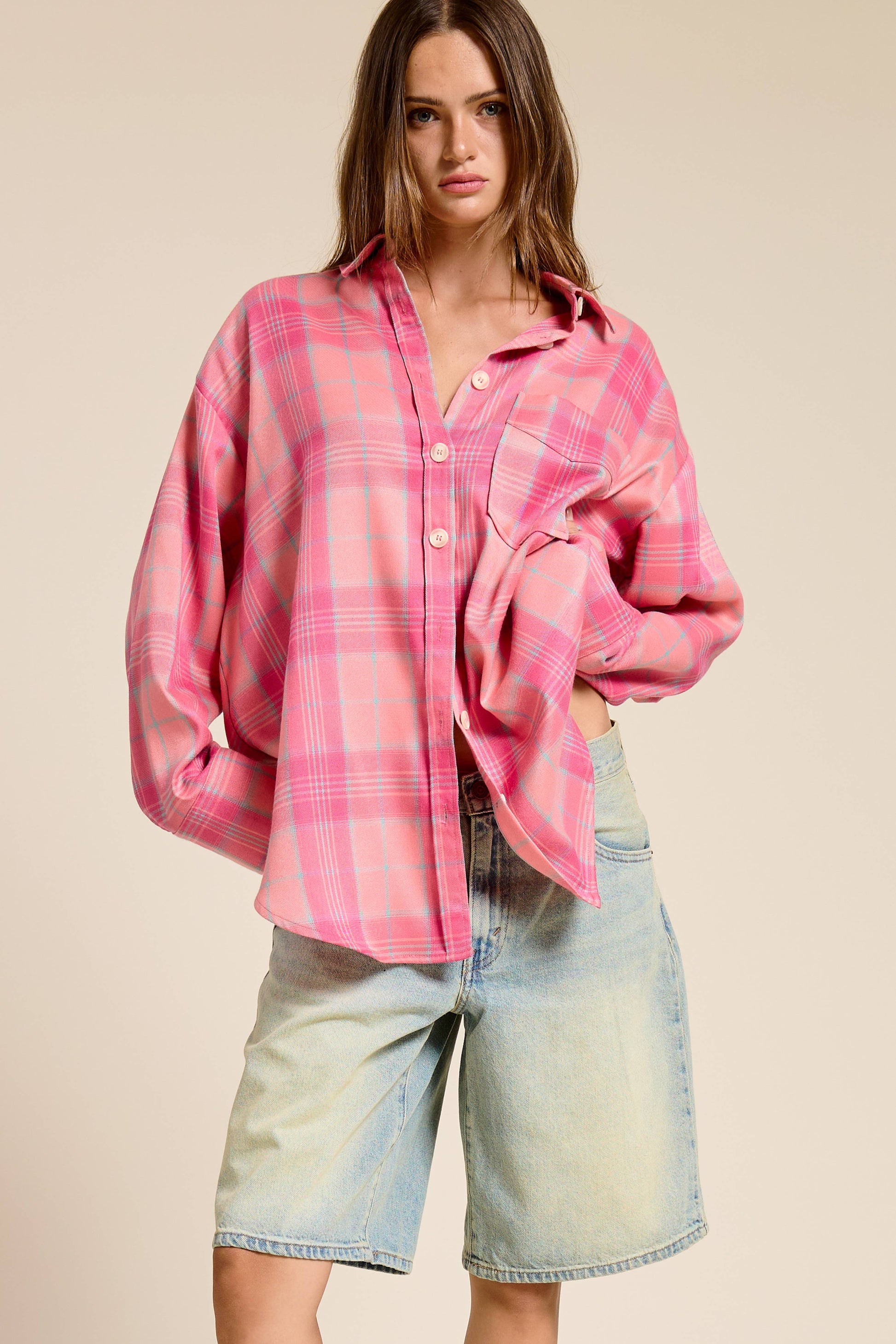A button-down plaid flannel shirt with a collar, front pocket detail, button-front closure, shirttail hem, and an oversized, long fit. Perfect for achieving a chic shirt dress look or as a stylish layering piece.