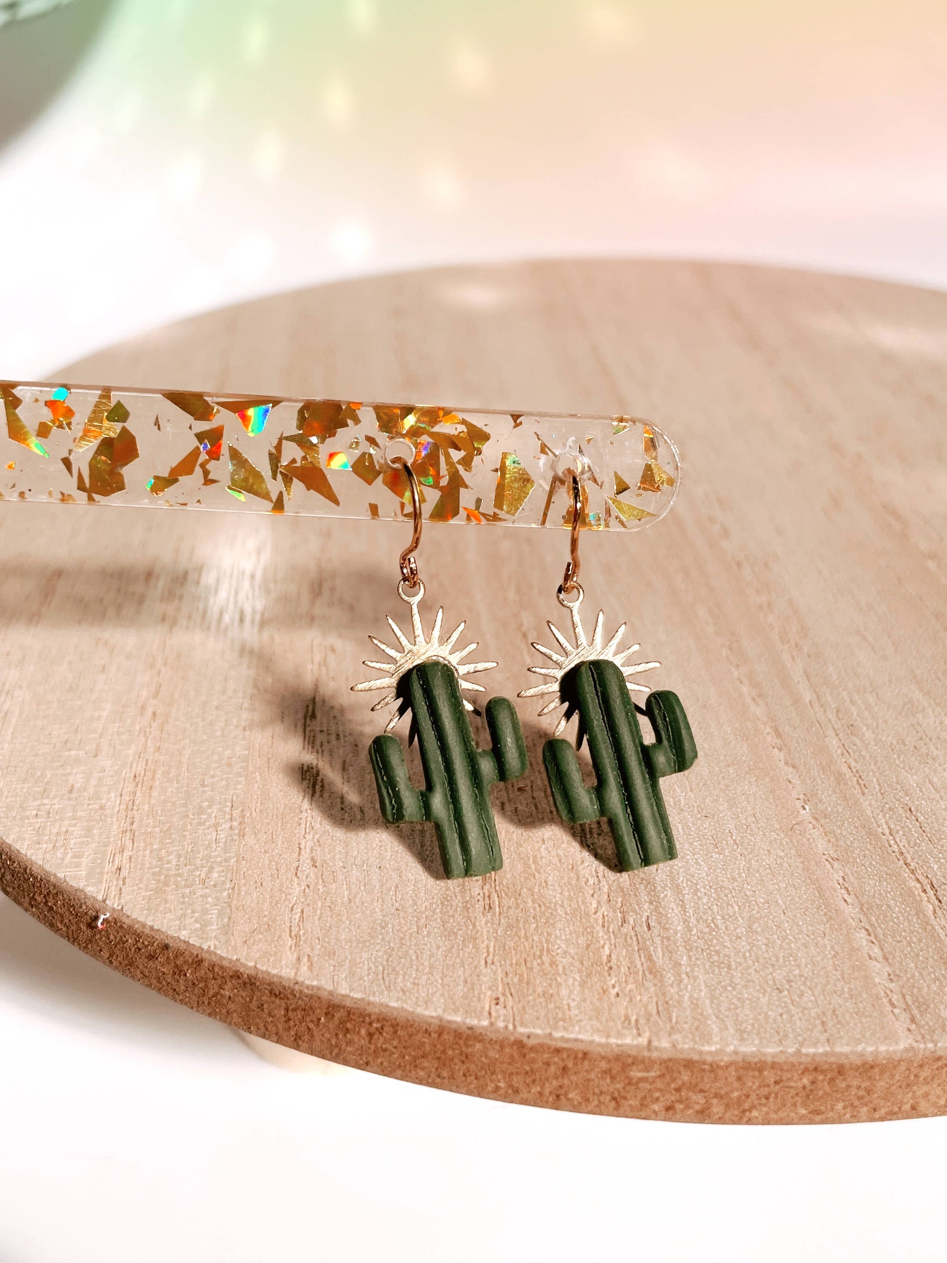 Handmade polymer clay cactus' in a medium green pressed with stripes for texture and a gold sunburst attached to the back. Each comes in a pair of 2 earrings. Totally lightweight. Earring hook is made of 18k plated gold (nickel free) - great for sensitive ears.