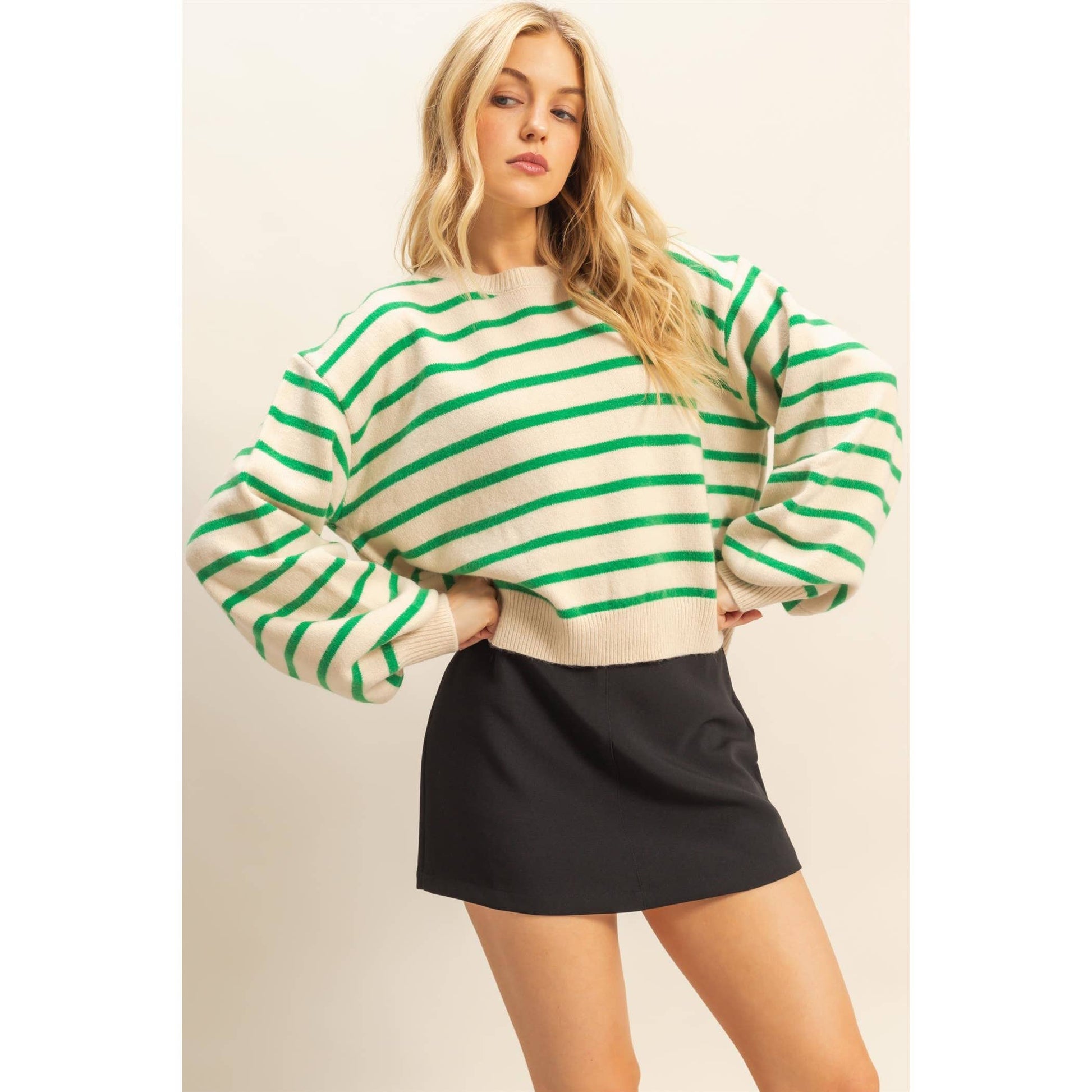 This striped sweater features a timeless crewneck design with a relaxed fit, ideal for versatile styling. Perfect for transitioning seasons, layer it over a collared shirt for a smart look or pair with denim for a casual outing. Its classic stripes offer a playful yet refined aesthetic, making it a staple for both office and leisure. 42% acrylic 30% nylon 28% polyester Model Is 5' 6" Tall, 32" Chest, 24" Waist, 32" Hips And Wearing A Size Small Imported. Designed In The USA