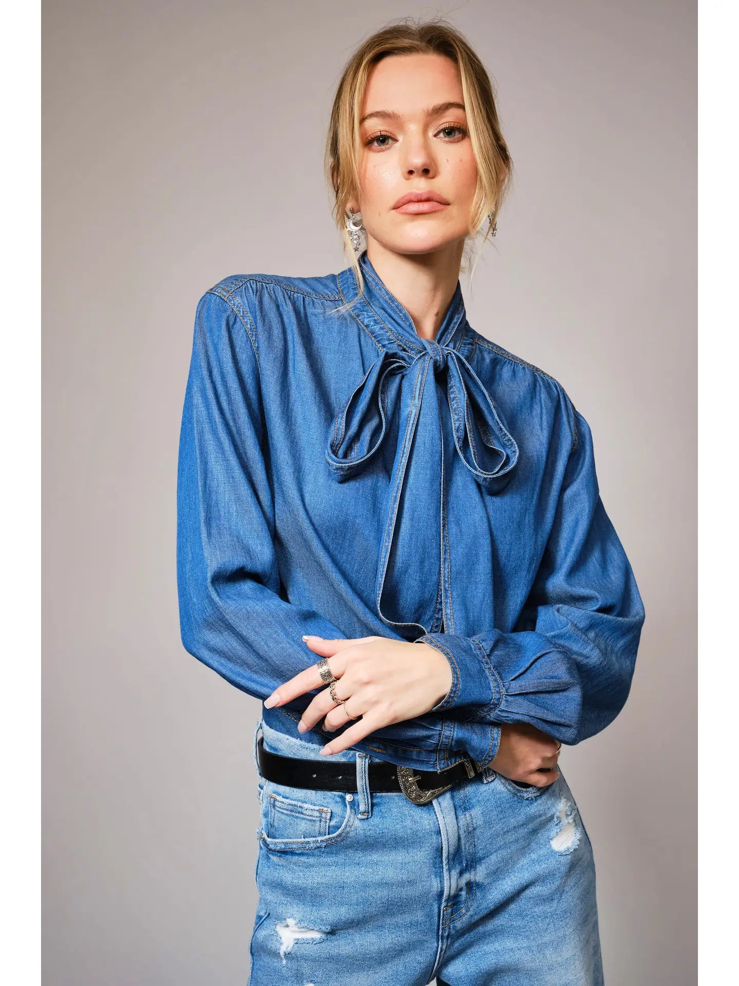 Soft cotton Tencel blend chambray blouse featuring a tie neck, hidden button closure, and long sleeves with button cuffs. Designed with a relaxed fit for effortless styling.
