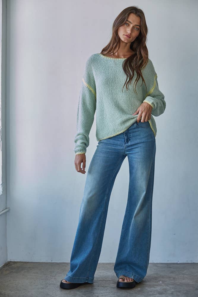 Knit Sweater Cotton Viscose Round Neck Long Sleeve Pullover Top With Stitch Detail