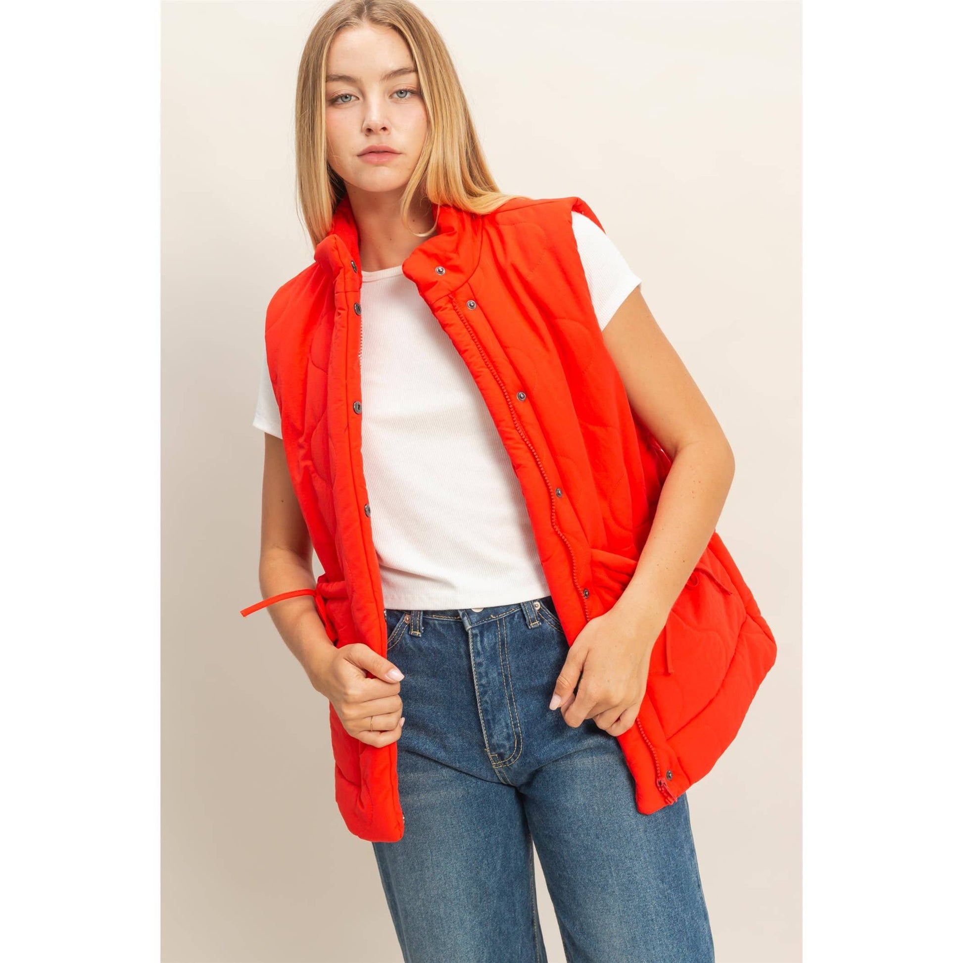 Embrace cooler days with this sleeveless puffer jacket, featuring distinctive wave quilting and drawstring ties at the waist for an adjustable fit. Ideal for layering over a long-sleeve tee or under a coat for extra warmth. Model Is 5' 8" Tall, 32" Chest, 25" Waist, 34" Hips And Wearing A Size Small Imported. Designed In The USA