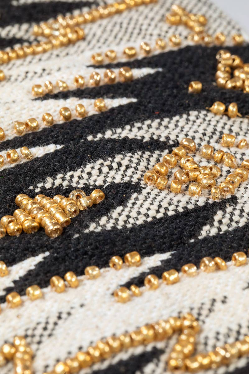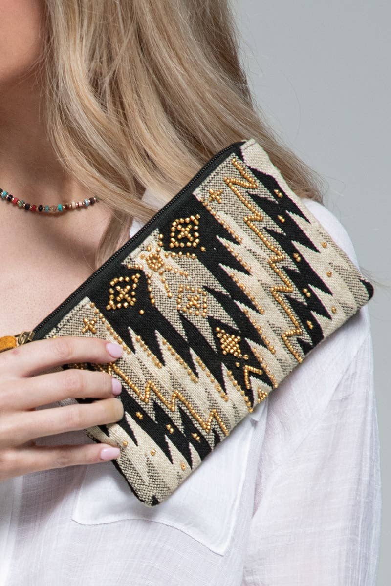 Handmade fine cotton yarn dye jacquard ethnic pattern with zig zag beads leather wristlet clutch